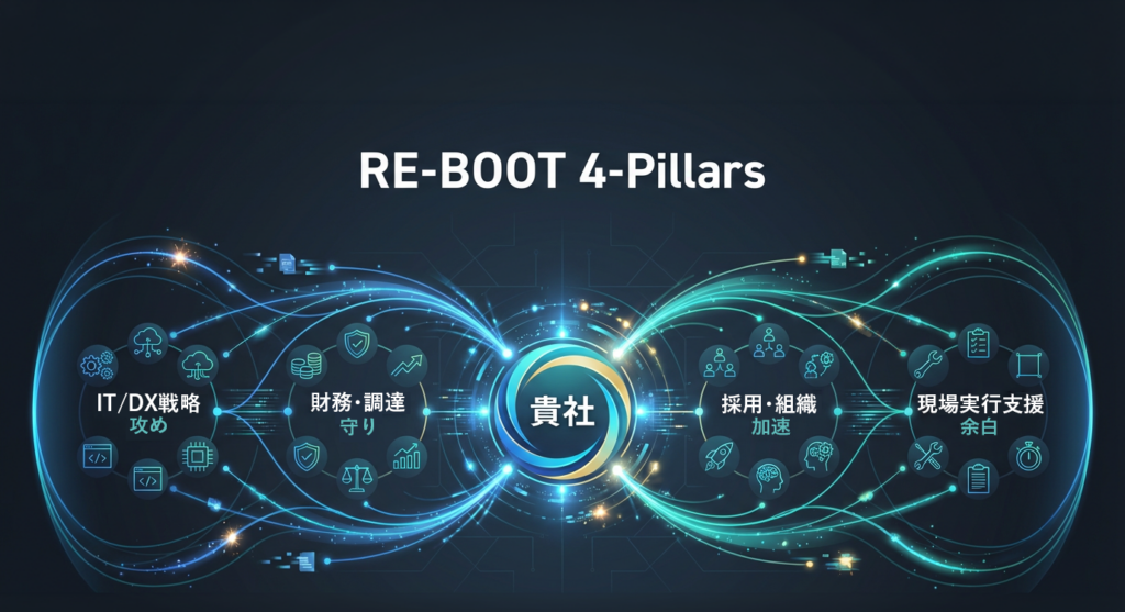 社長を「現場」から解放し、経営を「成長」へ再起動する。 3分で完了|無料ポテンシャル診断 まず自社の伸び代を診る(無料ポテンシャル診断) まず自社の伸び代を診る(無料ポテンシャル診断) 自治体DX・元信金支店長ら4つの専門知を同期。経営の停滞を全方位から突き抜ける。 この変革を現実のものとする、4人の実戦プロフェッショナル。 その変革を支える、確かな実績と公認の専門性。 IT/DX・財務・採用・実務。バラバラだった専門領域を統合し、『チーム型・経営参謀』という新標準を。 これらの実績は、私たちが共に歩んできた証に過ぎません。その数字の裏側にある『社長の孤独』を、私たちは誰よりも知っています。 「自分が頑張らなければ、会社は終わる」 その強い責任感が、いま、成長のブレーキになっていませんか? デジタル化の孤立 「ツールを入れれば楽になる」はずだった。現実は、自分だけがシステムを使いこなし、現場との距離は広がるばかり。DXが「ただのコスト」に成り下がっている。 深夜、一人で見る資金繰り表 銀行には言えない、社員にも見せられない。誰にも相談できないキャッシュの不安を、夜中に一人で資金繰り表を眺めながら飲み込んでいる。 「右腕」が育たない 自分が動けば解決する。その自負が、皮肉にも次世代のリーダーを育てる機会を奪い、組織を停滞させる要因になっている。任せたくても、任せられない。 実務の重力に縛られる 未来を構想したいのに、現実はトラブル対応と事務作業。社長の「時間」そのものが、会社の成長を止める最大のボトルネックになっている。 もう、一人で戦う必要はありません。 4人のプロフェッショナルが、あなたの会社の「再起動(RE-BOOT)」を 24時間365日、全方位からバックアップします。 バラバラだった経営要素が、 一つのチームで繋がる。 だから、再起動のスピードが違います。 そのIT投資を「利益」に変え、社長が現場を離れても回る仕組みを。 自治体DXアドバイザー / 仕組み化による「攻め」のスペシャリスト 則直 豪 銀行を味方にし、キャッシュフローの不安をゼロにする「守り」の財務。 信用金庫 元支店長 / 金融機関交渉・資金調達のスペシャリスト 居谷 謙祐 既存社員を「自走するプロフェッショナル」へ覚醒させ、自律して機能する組織に。 人材開発支援 / 既存資産の「覚醒」と組織同期のスペシャリスト 渡部 幸 社長の時間を月に20時間こじ開け、経営に「最高の余白」を。 事務効率化・現場実行支援 / 複雑な実務をシンプルに解きほぐすプロフェッショナル 藤井 幹太 そのIT投資を「利益」に変え、社長が現場を離れても回る仕組みを。 自治体DXアドバイザー / 仕組み化による「攻め」のスペシャリスト 則直 豪 銀行を味方にし、キャッシュフローの不安をゼロにする「守り」の財務。 信用金庫 元支店長 / 金融機関交渉・資金調達のスペシャリスト 居谷 謙祐 既存社員を「自走するプロフェッショナル」へ覚醒させ、自律して機能する組織に。 人材開発支援 / 既存資産の「覚醒」と組織同期のスペシャリスト 渡部 幸 社長の時間を月に20時間こじ開け、経営に「最高の余白」を。 事務効率化・現場実行支援 / 複雑な実務をシンプルに解きほぐすプロフェッショナル 藤井 幹太 わずか3分。経営の現在地を可視化する。 01 診断回答 PC・スマホ最適化UIで、直感的に20問に回答。 02 精密解析 IT・財務・採用・実行の4軸で、貴社のポテンシャルを即座にスコアリング。 03 戦略レポート 専任の「経営参謀ユニット」が導き出す、現状を打破するための「次なる一手」を即時発行。 無料で伸び代を診る 無料で伸び代を診る 🎁 【限定特典】診断完了後、『再起動マンガ』をプレゼント もう、一人で抱え込む経営は終わりにしませんか。 「自分が動かなければ、会社が止まる」その責任感で、社長はこれまで十分すぎるほど戦ってこられました。しかし、DX、財務、採用、実行支援……。現代の経営課題は、もはや一人の天才が解決できるほど単純ではありません。私たちは、それぞれの専門領域を極めた4人のプロ集団です。私たちがあなたの「外部経営参謀」として同期することで、社長は「現場」という重力から解放され、本来の仕事である「未来」へと集中できる。バラバラだった要素を一つに繋ぎ、停滞した経営を再起動(RE-BOOT)させる。その第一歩を、ここから共に踏み出しましょう。 無料ポテンシャル診断はこちら 無料ポテンシャル診断はこちら